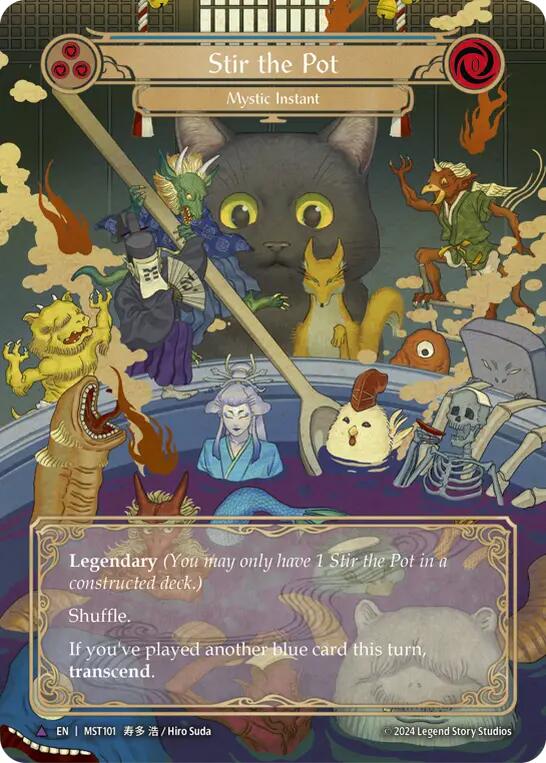 Legendary (You may only have 1Stir the Pot in a constructed deck.) Shuffle. If you've played another blue card this turn, Transcend. (Put this into its owner's hand flipped.)